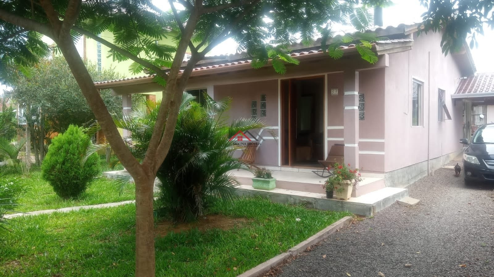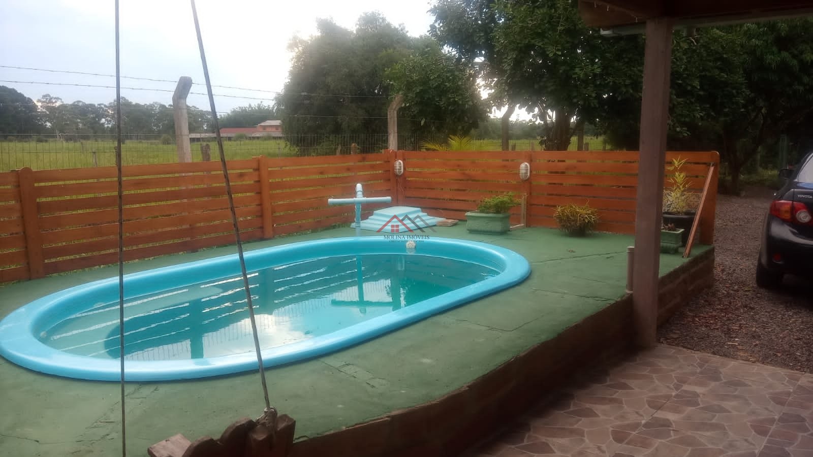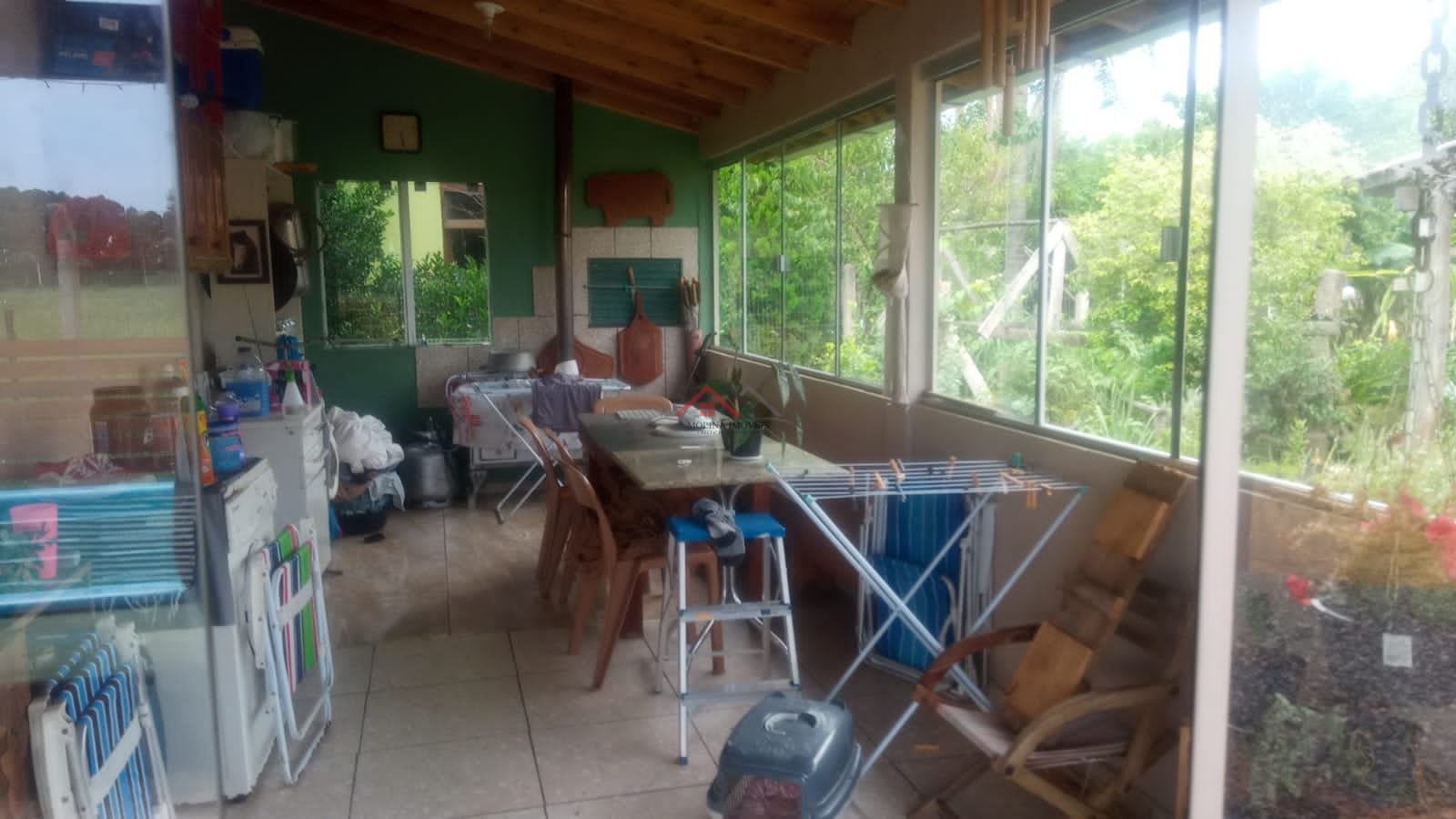 O imóvel conta ainda com galpãozinho pequeno com banheiro, piscina e um amplo terreno de 550 m², totalmente cercado, arborizado e gramado, oferecendo privacidade e tranquilidade.